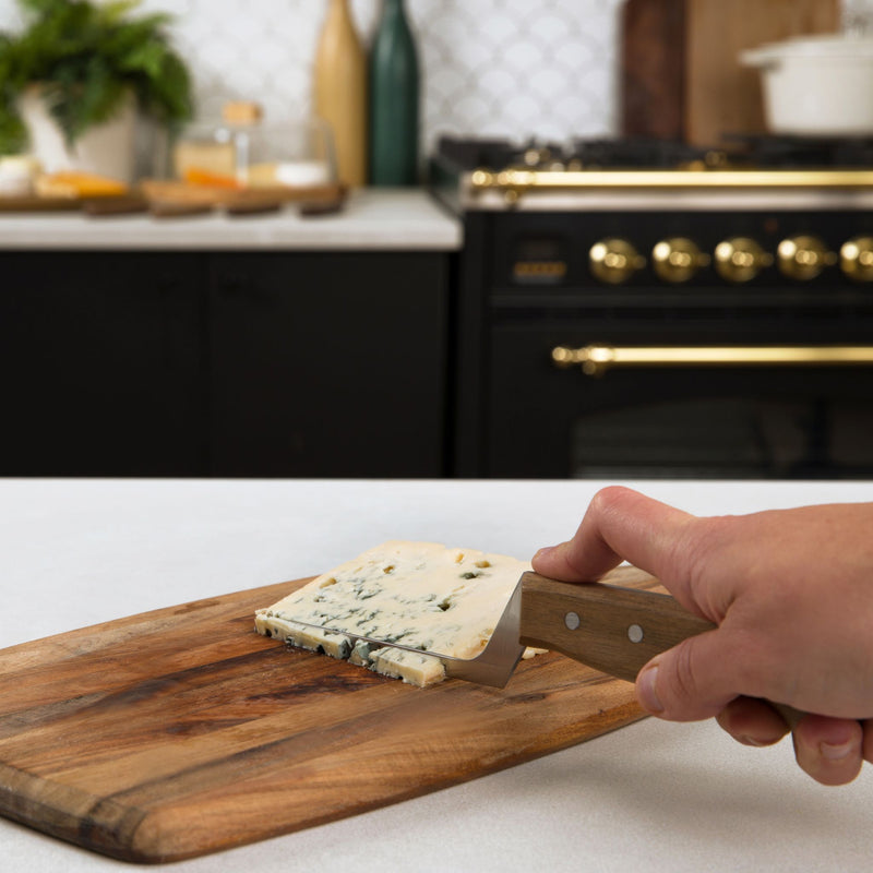 This thin blade is designed as a blue cheese knife and will easily cut all blue cheese without making a complete mess.